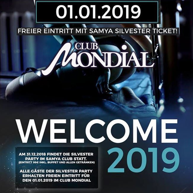 Welcome 2019 Neujahrsparty im Mondial 1.1.2019 Alle Gäste der Samya Silvesterparty haben Eintritt frei! Wir freuen uns auf Deinen Besuch Team Mondial