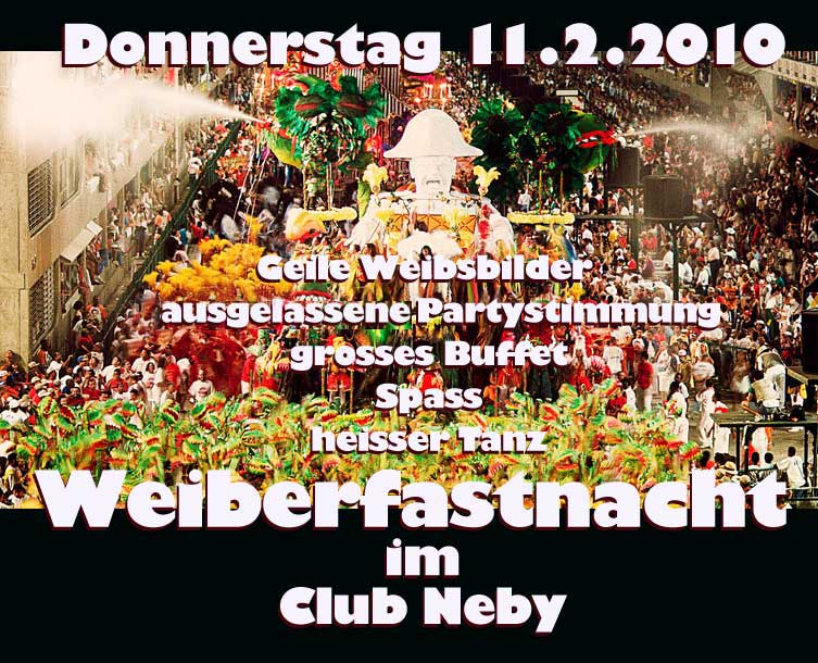 Am 11.2.2010 findet im Club Neby ein besonderer Motto-Event statt: Wir veranstalten unsere Weiberfastnachtsparty 2010 Wie immer ist für ausgelassene Stimmung, heisse Frauen, üppiges Buffet gesorgt. Wir freuen uns über gute Laune und zahlreiches Erscheinen.