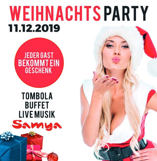 Mittwoch 11.12.2019 WEIHNACHTSPARTY Jeder Gast bekommt ein Geschenk Tombola, Buffet, Livemusik Es grüßt FKK & Saunaclub Samya Kirschbaumweg 26A, 50996 Köln www.samya.de
