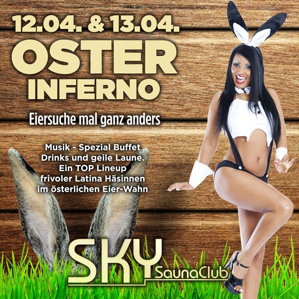 Die ersten Sonnenstrahlen stehen am Himmel und Ostern steht vor der Tür. Der Sky Saunaclub macht daraus ein kultverdächtiges Partymotto: Eiersuche mal ganz anders Ein erweitertes Top-Lineup frivoler Latina Häsinnen konzentriert sich ganz auf die wertvollsten Stücke der männlichen Gäste und ist wie immer in gutgelaunter Partystimmung. Musik Ein Spezialbuffet Showas Drinks und gute Laune Wir freuen uns auf Dich. Dein Sky Saunaclub Sky Saunaclub Deutscher Ring 40 42327 Wuppertal Varresbeck +49 (0) 202 75826033 www.sky-saunaclub.com