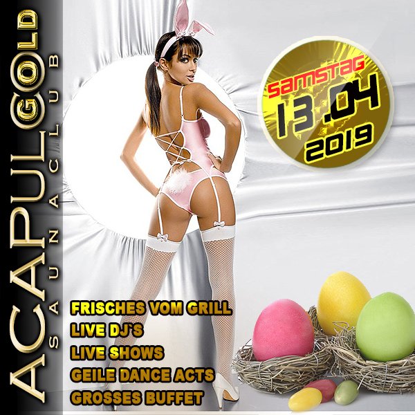 Samstag, 13.04.2019 Rattenscharfe Pornohasen gieren nach harten Eiern auf der Osterparty im Acapulco Gold Ratingen Frisches vom Grill Live DJs Live Shows Geile Dance Acts Großes Buffet www.fkkacapulco-gold.de