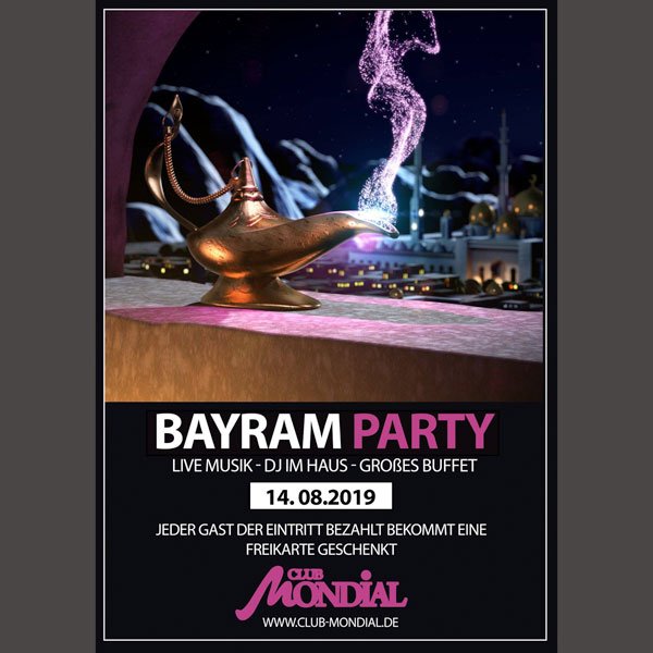 Liebe Gäste, Bayram-Party im Club Mondial Köln 14.08.2019 Live Musik, DJ im Haus, Großes Buffet Jeder Gast, der Eintritt zahlt bekommt eine Freikarte geschenkt. Club Mondial Hugo-Junkers-Straße 10, 50739 Köln https://www.club-mondial.de/