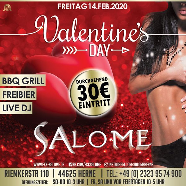 Freitag, 14.02.2020 Valentines Day im Salome BQ Grill Freibier Live DJ Durchgehend Eintritt 30€ FKK Salome - Riemkerstr. 110 - 44625 Herne www.fkk-salome.de