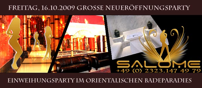 Das Salome meldet: Der Umbau unseres orientalischen Badetempels ist abgeschlossen. Am Freitag, 16.10.2009 steigt unsere große Einweihungsparty. Alle Freunde und die, die es noch werden wollen, sind herzlich willkommen. Bilder findet Ihr auf der neu gestalteten Homepage. (Anm.: Persönliche Einladungen an alle Freiercafe Mitglieder gehen per Newsletter raus...Macchiato)