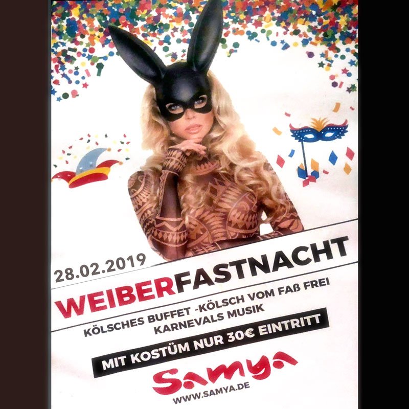 Am 28.02.2019 steigt in der Karnevalshochburg Samya die traditionelle Weiberfastnachts-Party Kölsches Buffet Kölsch vom Faß frei Karnevalsmusik Mit Kostüm: Eintritt nur 30€