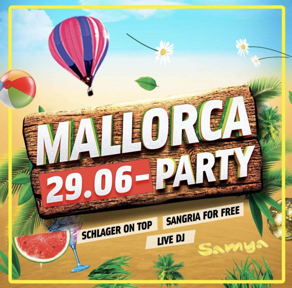 Passend zur Hochsaison gibts im Samya die Mallorcasause… 29.6.22 Mit Sangria , Schlager/Mallorca Musik vom Live DJ Und natürlich dem gewohnten Samya Programm aus Buffet,Drinks,Sauna und Girls