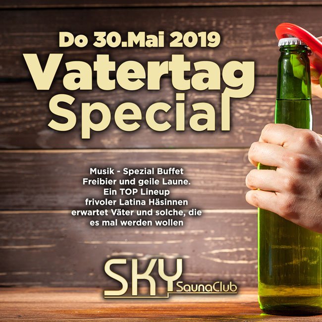 Liebe Gäste, mit Bollerwagen in die Prärie oder in den Biergarten? Das war gestern. Am 30.Mai 2019 startet das SKY Vatertags-Special! Musik - Spezial Buffet Freibier und geile Laune. Ein TOP Lineup frivoler Latina Häsinnen erwartet Väter und solche, die es mal werden wollen SO MUSS VATERTAG AUSSEHEN! www.sky-saunaclub.com