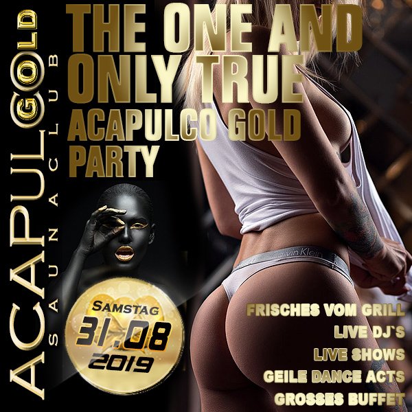 Samstag, 31.08.2019 THE ONE AND ONLY TRUE ACAPULCO GOLD PARTY Frisches vom Grill, Live DJs, geile Dance Acts, großes Buffet, Live Shows & viele Überraschungen Live DJ´s - Live Shows - Geile Dance Acts Acapulco Gold ROBERT-ZAPP-STR. 2A 40880 RATINGEN Öffnungszeiten: Täglich von 10 - 03 Uhr INFO: 02102-700 63 36 www.fkkacapulco-gold.de