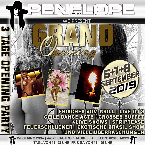 3 Tage lang GRAND OPENING PARTY im Penelope de Luxe 6., 7. & 8. September 2019 Frisches vom Grill, Live DJs, geile Dance Acts, großes Buffet, Live Shows & viele Überraschungen Penelope de luxe Westring 233a · 44579 Castrop-Rauxel · Tel.: 02305-14223 Täglich 11 - 03 Uhr · Fr & Sa 11 - 05 Uhr web: www.saunaclub-penelope.de