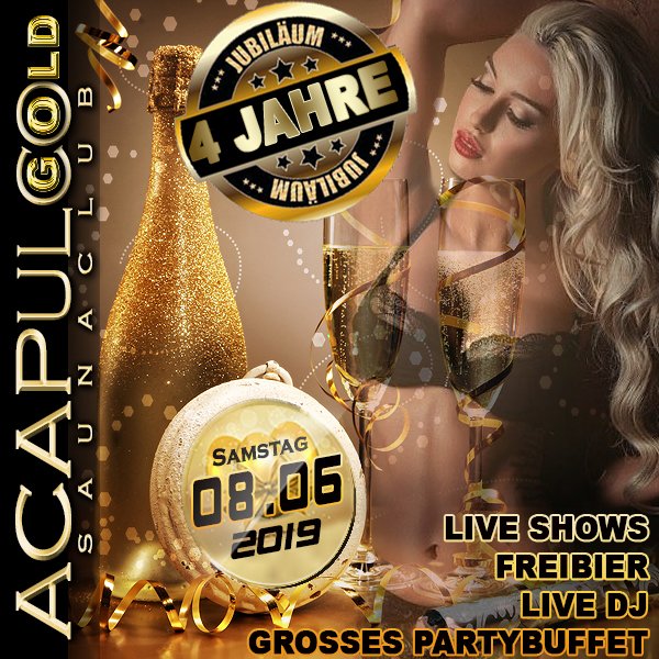 Liebe Gäste am 8.6.2019 wird das Acapulco Gold 4 Jahre alt. Wir feiern mit Euch daher die Jubiläumsparty!! ganz besondere Showacts Ein Special Partybuffet Musik Freibier bilden ein Rahmenprogramm mit vielen Überraschungen. Wir freuen uns auf Dich Team Acapulco Gold
