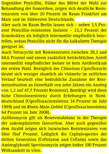 Danke für die Quelle!! Für schnell-Leser die Kernaussage: Es gibt Tripper, bei denen gewisse Antibiotika nicht mehr helfen... Möge der Text keine Anleitung für Selbstbehandlungen sein. Auszug der entscheidenden Passage für Leute ohne PDF Lesemöglichkeit im Bildanhang