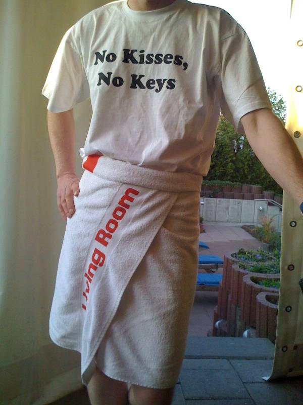 Man munkelt, es seien auch schon männliche Gäste gesichtet worden, die den Oberkörper mit einem weißen T-Shirt bedeckt hatten! Habe ich aber selber alles noch nicht gesehen. Mir ist da nur vom Miniforentreff in der letzten Woche die Kombi Hessendress + Eisbärenfell in Erinnerung.