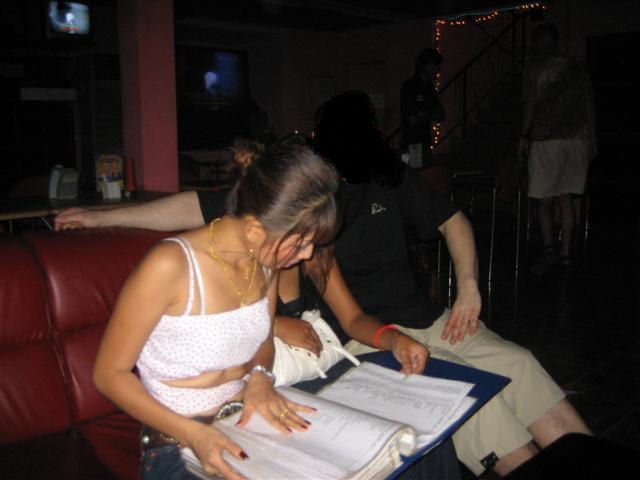 06.05.2007 Da wir die letzten Tage einen Totalabsturz nach dem anderen hatten, kommen wir leider erst jetzt dazu, wieder etwas für euch zu schreiben. Fangen wir mal mit dem 06.05. an. Nachmittags gab's eine spontane Party an der Königstheke. Nix war geplant, es hat sich einfach so ergeben! Aber ihr wißt ja selbst, dass die spontanen Partys meistens die besten sind! Fast alle Gäste waren anwesend und auch unser Herbergsvater Eddy hat ordentlich mitgefeiert! Auch die neue Staff des Hotel König ist immer für Parties zu haben!! Ausserdem hatten wir an diesem Abend ja auch noch eine weitere Verpflichtung! Die Eröffnungsparty der neuen Didi Bar stand an! Über dieses freudige Ereigniss wird in wenigen Minuten der MS2101 berichten.... Von mir: An diesem Abend stand ja die Eröffnung der neuen Didibar an, die im übrigen sehr sehr schön geworden ist. WIr machten uns mit mehreren Leuten aus dem König auf den Weg zur Didibar, indem wir einen Bahtbus charterten. Um ca 21:00 erreichten wir die Didibar, wo die Party in vollem Gange war und fast kein Platz mehr zu kriegen war, wir machten uns dann über das Buffet her und vernichteten einige Drinks. Fazit: Es war eine tolle Eröffnungsparty mit einem tollen Gastgeber Einige Leute machten sich gemeinsam auf den Weg in Richtung Soi 7/8 um was nettes für die Nacht zu finden, V.... wurde auch sehr schnell fündig, sah eine kleine und drückte ihr die Barfine in die Hand ohne ein Wort zu sprechen Wir machten dann halt in der Soi 8 der Name der Bar "Best Bar" hier war es ganz lustig gewesen. Einige Leute machten sich gemeinsam auf den Weg in Richtung Soi 7/8 um was nettes für die Nacht zu finden, Volker wurde auch sehr schnell fündig, sah eine kleine und drückte ihr die Barfine in die Hand ohne ein Wort zu sprechengrosses Lachen Wir machten dann halt in der Soi 8 der Name der Bar "Best Bar" hier war es ganz lustig gewesen. Anschliessend sind wir dann in die Walking Street gegangen, wo wir einige Gogos abklapperten und uns so ziemlich die Kante gegeben haben, es wurde jetzt Tequila bis zum abwinken getrunken, und so langsam waren alle besoffen. Der Höhepunkt war die Living Doll 1 wo mehrere Ladys aus Australien anwesend waren, was sich hinterher hinausstellte war das ein Frauen Rugby Team Die Mädels haben so ein wenig den Gogo Tänzerinnen den Rang abgelaufen und tanzten an der Stange, es war echt richtig geil. Anschliessend sind wir dann weiter ins Lucifer gezogen, aber nun war der Punkt erreicht wo jeder besoffen war, es war trotzdem sehr lustig (glaube ich ). Bis die Tage jung´s Fast vergessen..... Bum bum gabs bei mir heute nicht, da meine Lady die Rote Flut hatte... Also hab ich sie 2 mal Blasen lassen und bin zufrieden eingeschlafen