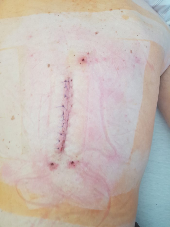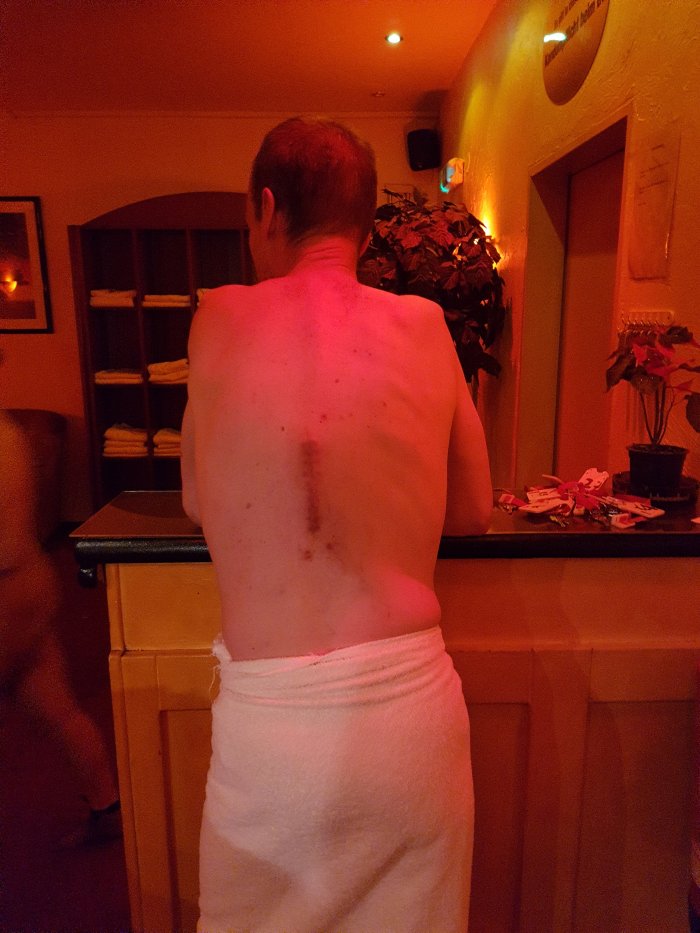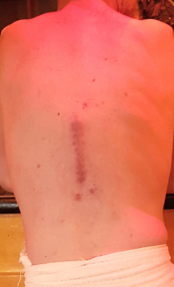Am Di 16.01. wurde die Versteifung meiner Wirbelsäule rausgenommen (nachdem 2 gebrochene Wirbel wieder stabil waren), am Do 18.1. war ich dort MIT Pflaster in der Sauna ... da sah es unter dem Pflaster so aus wie auf dem ersten Bild. Genau 1 Woche später (9 Tage nach der OP) hab ich mir sogar vom General extra nochmal ein Pflaster draufmachen lassen, da sah es so aus wie auf dem zweiten/dritten Bild (hat der General gemacht!)