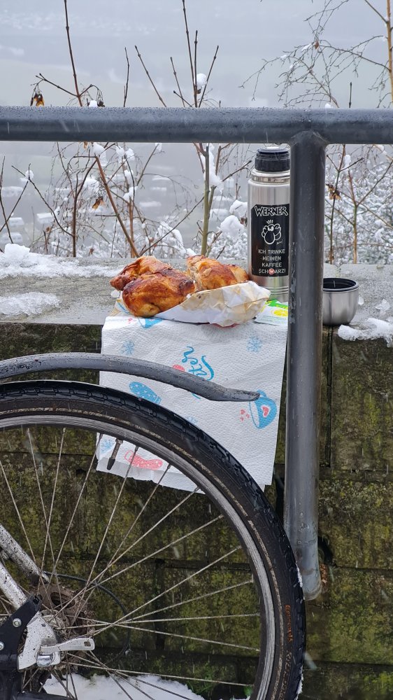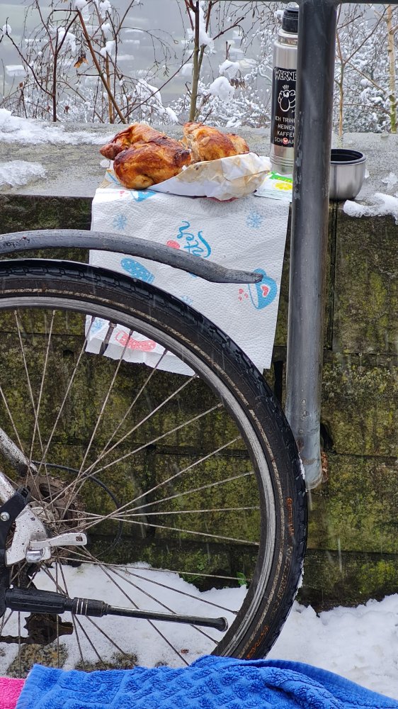 Ganz oben in aller Ruhe Frühstück gemacht. Den ganzen Gummiadler nicht geschafft, ein halben mit in die Maloche genommen.